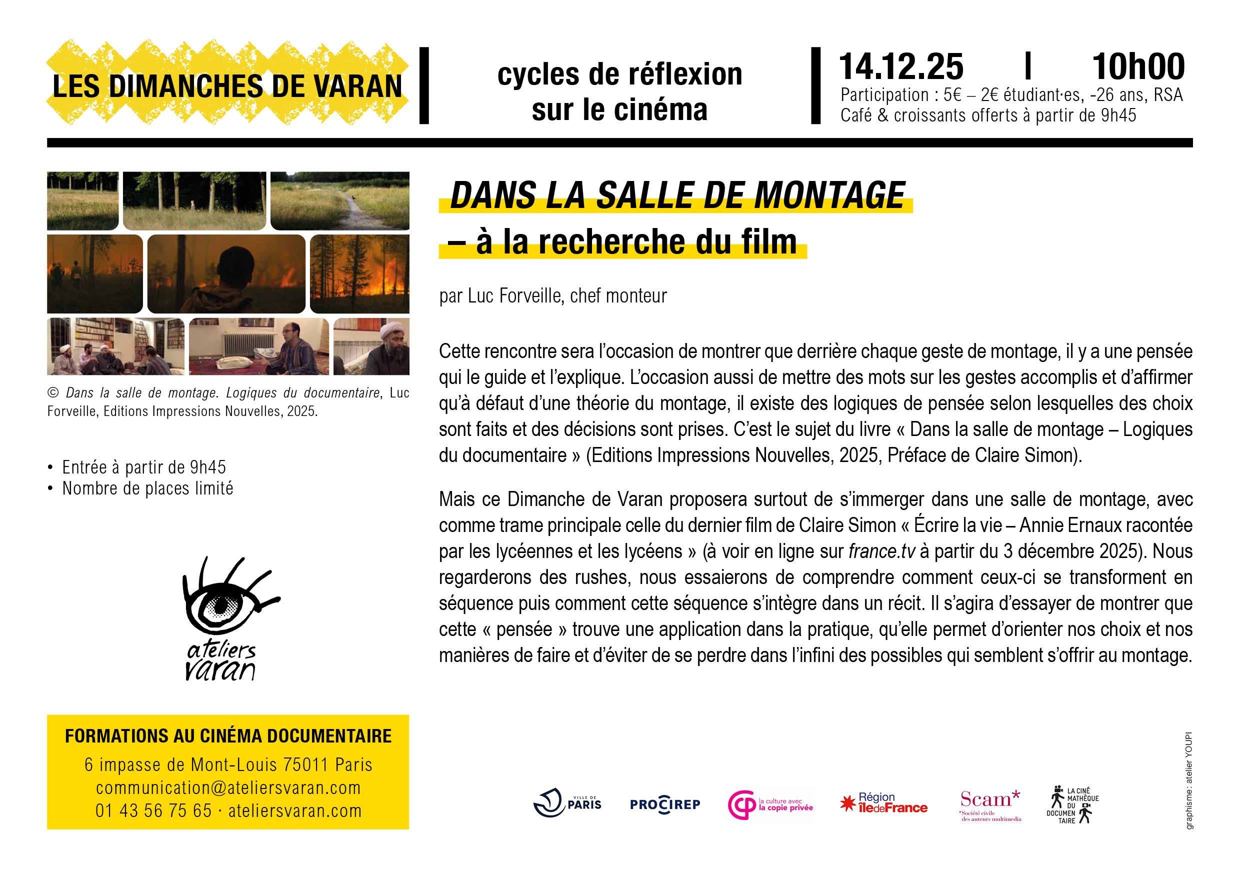 Cette rencontre sera l’occasion de montrer que derrière chaque geste de montage, il y a une pensée qui le guide et l’explique. L’occasion aussi de mettre des mots sur les gestes accomplis et d’affirmer qu’à défaut d’une théorie du montage, il existe des logiques de pensée selon lesquelles des choix sont faits et des décisions sont prises. C’est le sujet du livre « Dans la salle de montage – Logiques du documentaire » (Editions Impressions Nouvelles, 2025, Préface de Claire Simon).