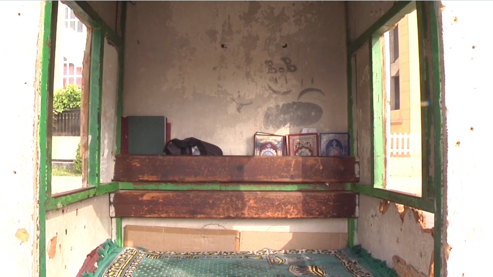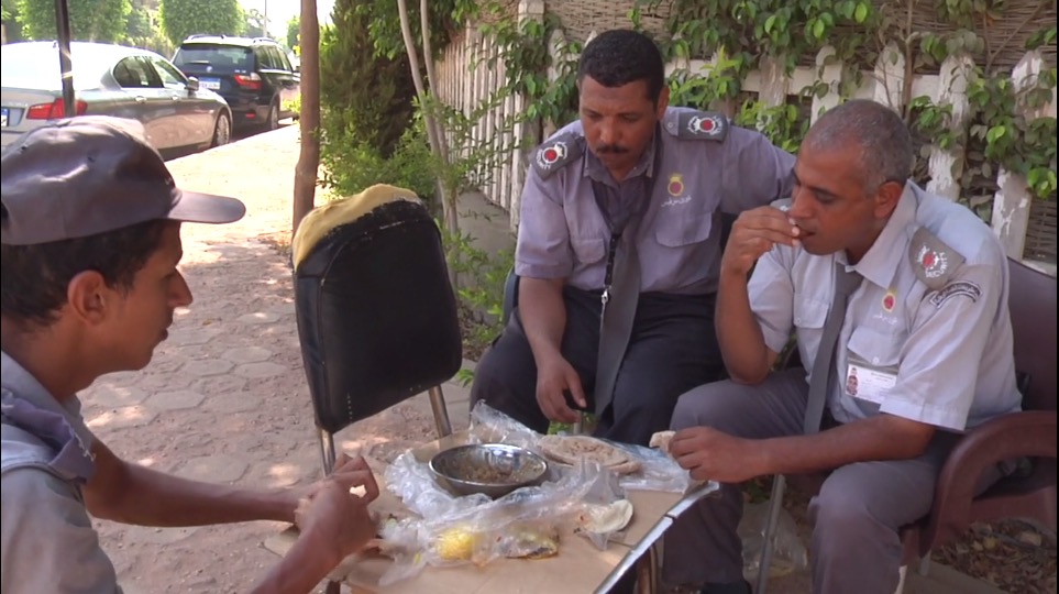 À l'ombre et à l'air libre, trois hommes partagent un repas, avant de retourner travailler. Ils sont agents de sécurité, dans une minuscule guérite ou en plein soleil. Toute la journée, ils veillent, patrouillent, attendent… Et lorsque le soleil se couche, seul le temps semble avoir été en mouvement.